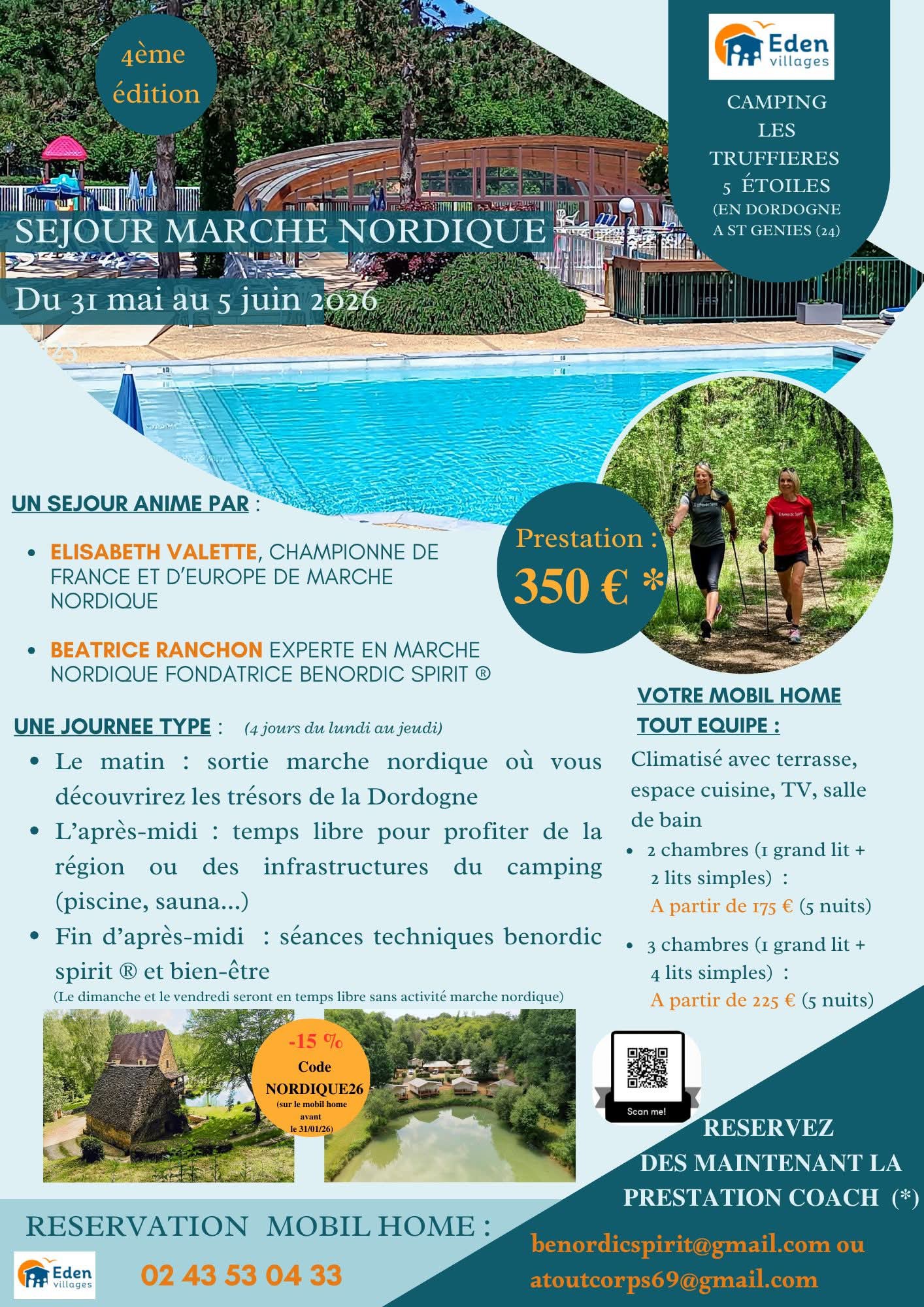 Vous pouvez venir en couple, entre amis ou en club. Vous réservez un mobil home au tarif séjour marche nordique (voir flyer) avec Eden Village.